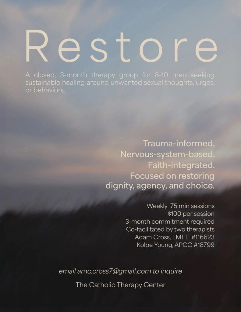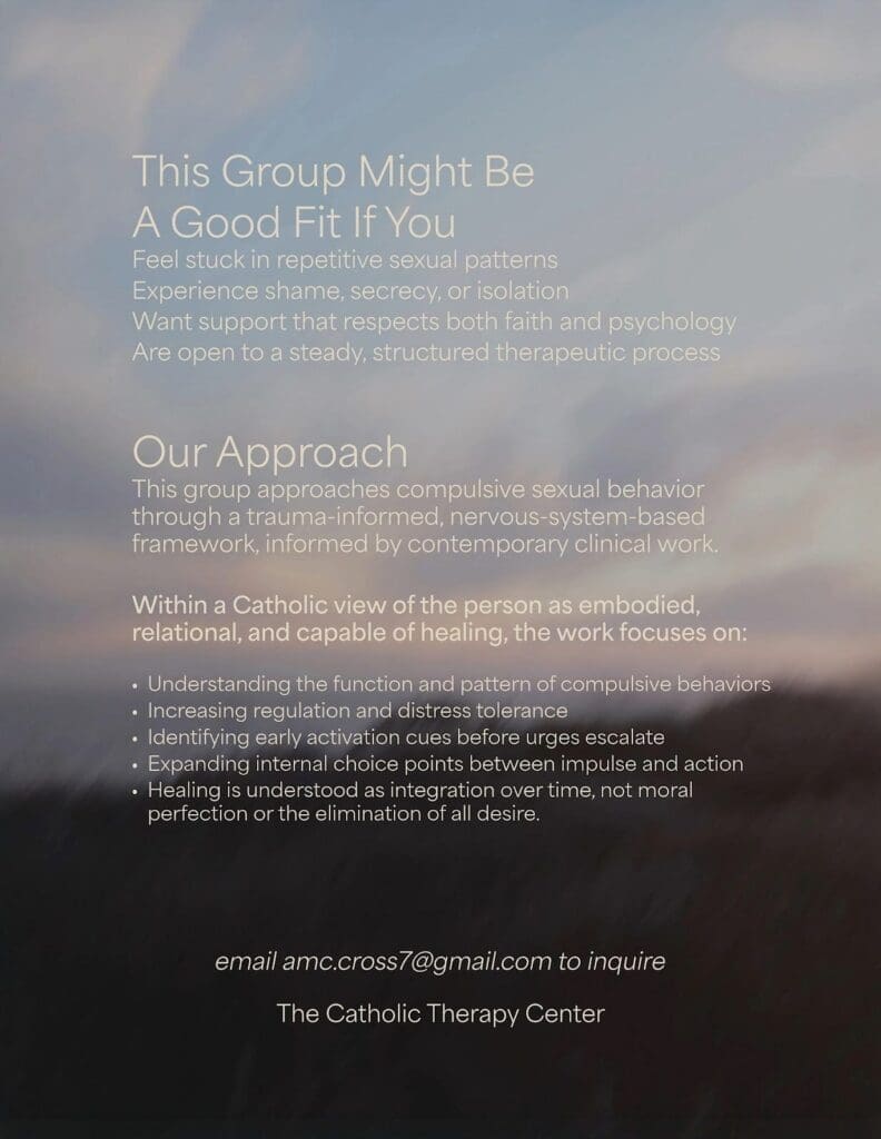 It’s a compassionate, non-judgmental space where men can explore the roots of their behavior through a trauma-informed, nervous-system-aware framework, while also grounding everything in the truth of the Catholic faith.