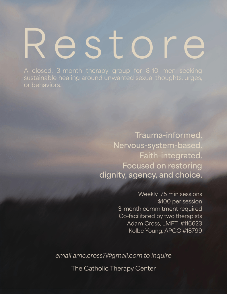 Adam Cross is a Licensed Marriage and Family Therapist (#116623), writer, and speaker who is passionate about helping people experience healing and freedom rooted in their identity as beloved sons and daughters of God. He is the founder of the Catholic Therapy Center — a group practice dedicated to a holistic Catholic approach to healing the human person through the power of the Holy Spirit.