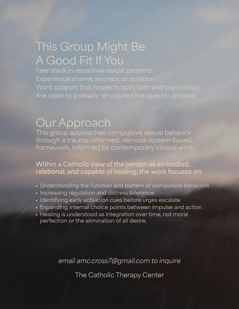 Clinically, I work with individuals, couples, and families who feel stuck in patterns of anxiety, shame, trauma, grief, or disconnection. My work focuses on helping people gently turn toward what has been difficult to hold, so that healing can emerge through safety, presence, and integration rather than pressure or performance. My approach is warm, relational, process-oriented, IFS- and nervous-system-informed, and grounded in a Catholic understanding of the human person as an integrated unity of body, mind, and spirit. Alongside my clinical work, I facilitate workshops and write on Substack at the intersection of psychology, neuroscience, and Catholic spirituality.